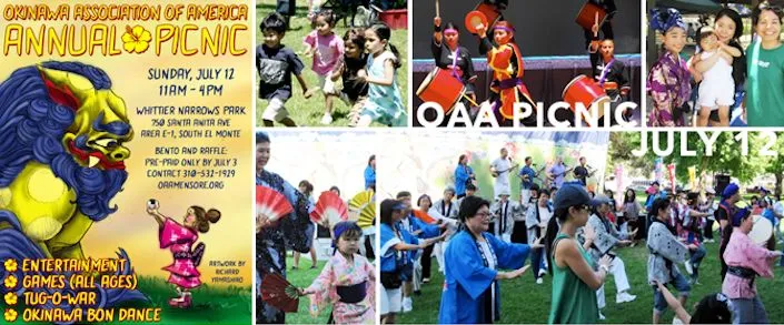 On Sunday, July 12, 11AM ~ 4PM, the Okinawa Association of America (OAA) will host its Annual Members Picnic at Whittier Narrows Park (750 Santa Anita Ave., Area E-1, South El Monte). Featuring live entertainment, kids games and races, raffle drawings, and Bon dancing, it's a perfect place for reunions or a Sunday outing with family and friends! (Non-members are also encouraged to attend and apply for membership at the picnic)